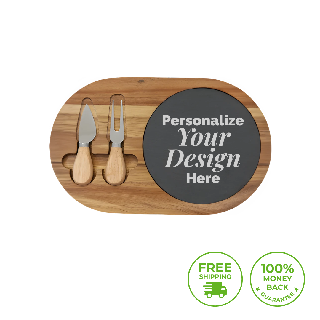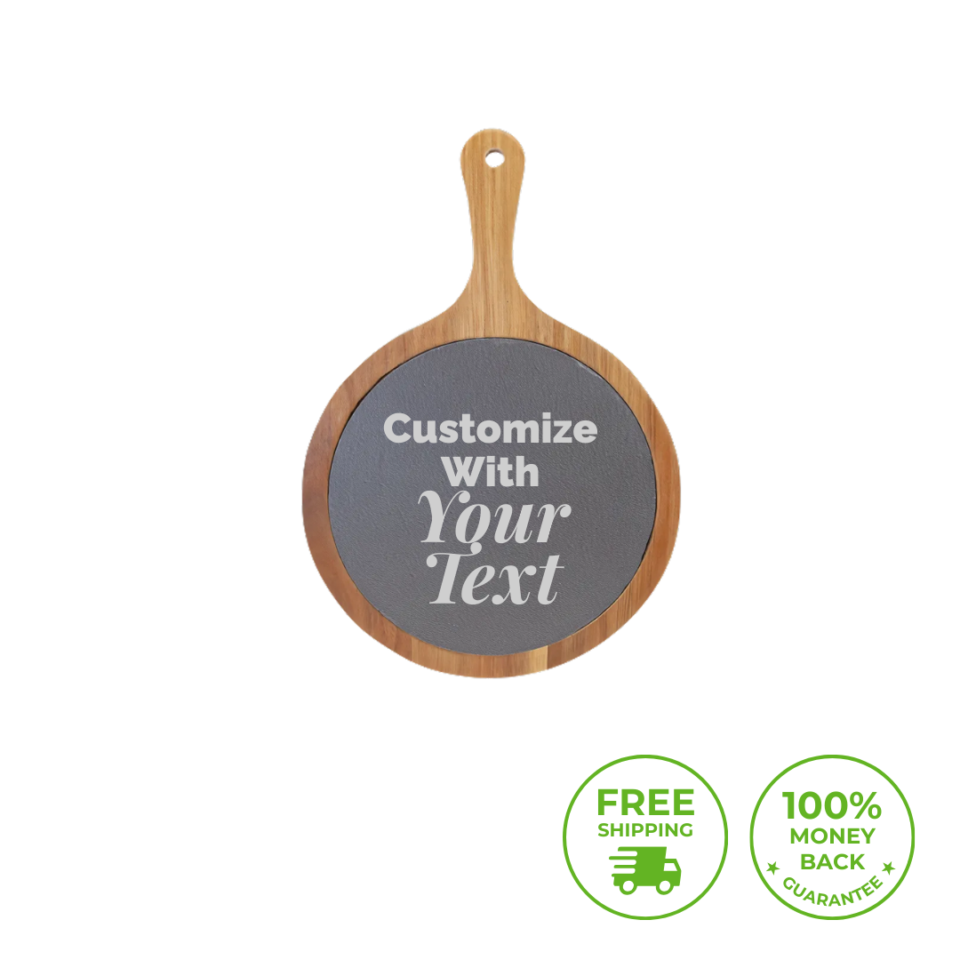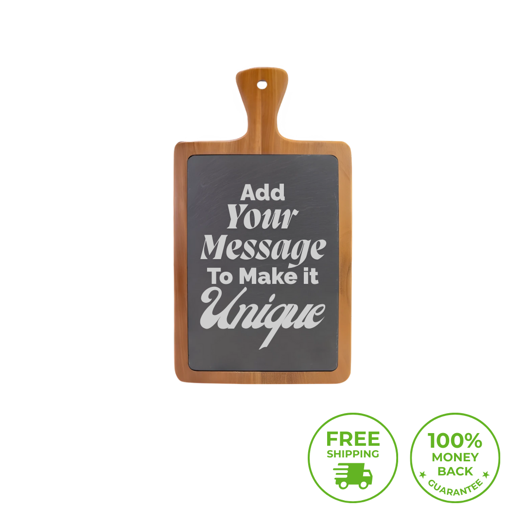 This charcuterie board pairs acacia wood with slate and custom engraving, offering an elegant centerpiece and thoughtful present—ideal for weddings, housewarmings, and meaningful milestones where personalization makes every celebration memorable.